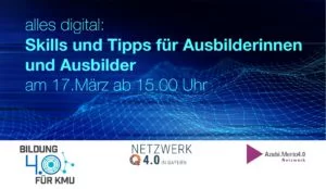 Die Online-Veranstaltung „Alles digital: Skills und Tipps für Ausbilderinnen und Ausbilder“ am 17.03.3021 von 15 bis 17 Uhr bietet wertvolle Anregungen für eine zukunftsorientierte Ausbildung: Von Azubimarketing bis hin zum Wissensmanagement teilt jedes der drei beteiligten Projekte seine Expertise zu Möglichkeiten, die Ausbildung von morgen zu gestalten. Seien Sie mit dabei und machen sich fit für die Ausbildung von morgen.