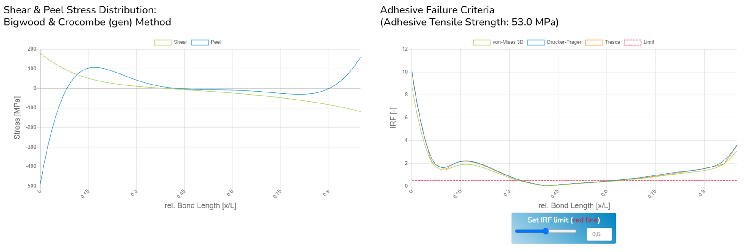 Beispiel für die Bewertung der Schub- und Schälspannungen sowie der Versagenskriterien entlang der Klebefuge: