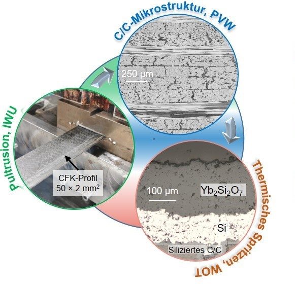 Hierzu applizieren die Teams der Professur Werkstoff- und Oberflächentechnik (WOT) der TU Chemnitz mittels thermischen Spritzens verschiedene Schichtsysteme auf die C/C-Profile, bestehend aus einer metallischen Haftgrundschicht und oxidkeramischen Deckschicht. Dann prüfen sie diese Profile hinsichtlich ihrer Leistungsfähigkeit unter anwendungsnahen thermozyklischen Bedingungen. Durch SiC kann die Haftung der Beschichtung an der Oberfläche der C/C-Substrate verbessert werden.