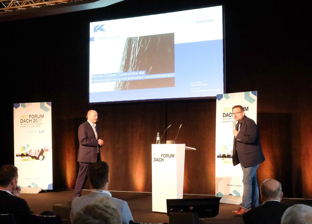 Im Mittelpunkt stand die von Roy Thyroff, Netzwerkgeschäftsführer von CU Bau, moderierte Session zum Thema „Können Carbon-Verbundwerkstoffe die zivile Infrastruktur neu definieren – für eine widerstandsfähigere und nachhaltigere Zukunft?“. Ziel der Session war es, die Potenziale carbonbewehrter Betonlösungen und faserbasierter Verstärkungssysteme im Hinblick auf Ressourcenschonung, Resilienz und Modularität zu beleuchten. Die vorgestellten Ansätze adressierten insbesondere Anwendungen im Schienenverkehr, bei Versorgungsnetzen und öffentlichen Bauwerken.
