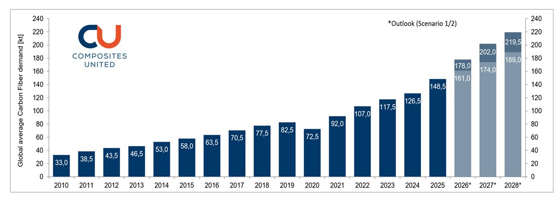 This year’s market report, now in its 16th edition, has been published annually by Composites United e. V. (CU) since 2010. The report serves as an overview of carbon fiber production and demand from a global perspective and is available in German and English. A highly consolidated summary is published in full and is quotable. A much more detailed long version is reserved for members of CU or can alternatively be purchased by non-members. The current version of the market report was presented on March 10, 2026 at JEC WORLD 2026 in Paris for the completed reporting year 2025.