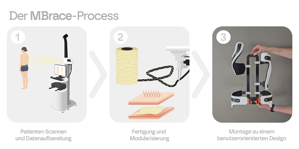 Das europäische Forschungsprojekt MBrace adressierte diese Defizite. Ein internationales interdisziplinäres Team aus Medizin, Medizintechnik, Materialforschung und Design entwickelte eine leichte, offene und modulare Orthesenstruktur, nutzerzentriert und auch formal ansprechend. Die offene Struktur verbessert die Luftzirkulation, reduziert unnötige Kontaktzonen und erhöht die Bewegungsfreiheit, ohne die therapeutische Stützfunktion zu kompromittieren.