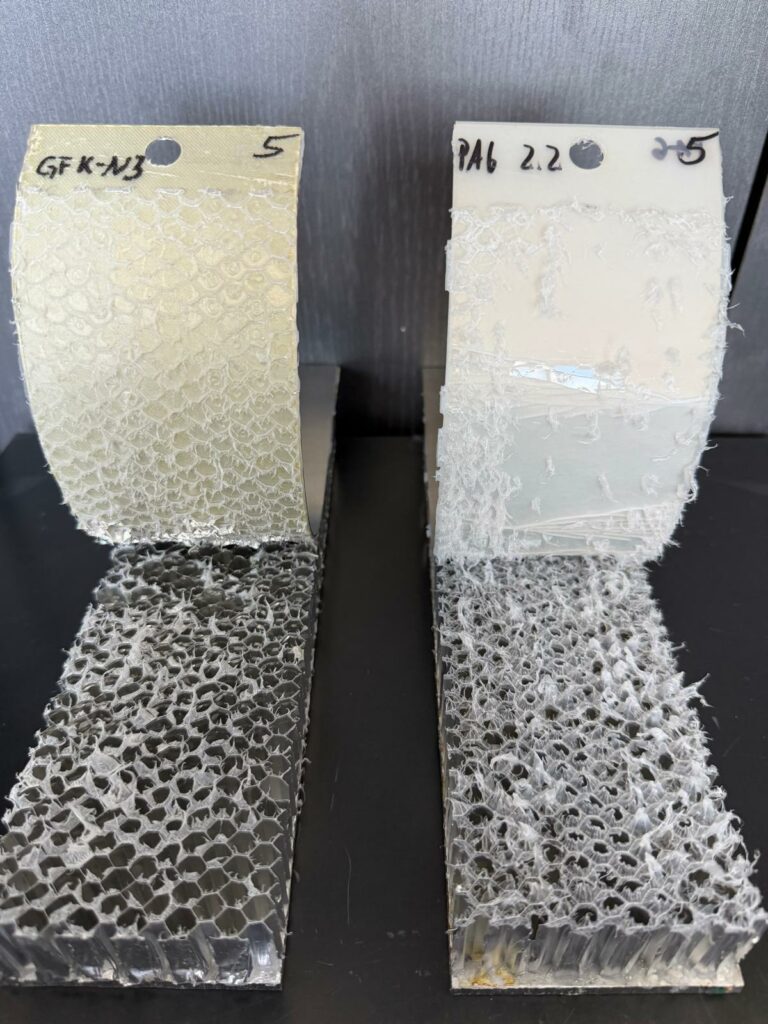 Für die Leistungsfähigkeit dieser Verbundstrukturen ist die Haftfestigkeit zwischen Wabenkern und Deckschicht von entscheidender Bedeutung. Die Bewertung der Verbundfestigkeit erfolgt über den Trommelschälversuch nach DIN 53295. Dabei wird die Deckschicht mittels einer Prüftrommel vom Kern abgeschält und das erforderliche Moment in N·mm erfasst. Zur Ermittlung der spezifischen Trommelschälfestigkeit wird dieser Wert auf die Probenbreite normiert (N·mm/mm bzw. N).