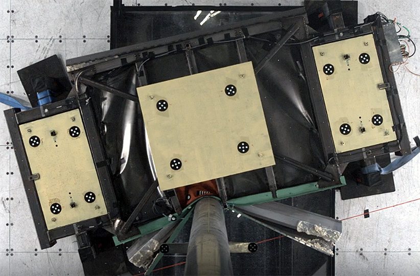 Um die mechanische Leistungsfähigkeit des Batteriegehäuses in FKV-Bauweise zu erproben, wurde der seitliche Pfahlaufpralltest nach NCAP als maßgebender Lastfall gewählt. Für die Validierung wurden die numerischen Simulationsergebnisse aus der Phase der Bauteilentwicklung für einen kompletten Prototypen mit Batteriezell-Dummys in der Bodenbaugruppe eines Fahrzeugs und ein realer Crashtest übereinandergelegt. Es ergaben sich Intrusionswege, die real nur wenig über denen der Simulation lagen. Die Ersatzbatteriezellen gleicher Größe sowie ähnlichen Gewichts und Festigkeit wiesen keine Beschädigungen auf.