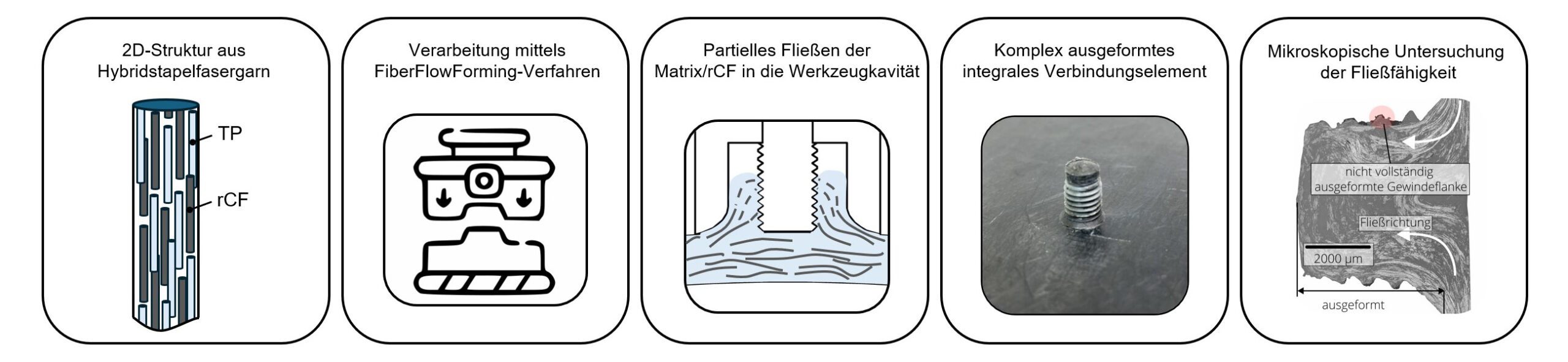 Die Verwendung von Stapelfasern bedingt einen Forschungsbedarf hinsichtlich der kontrollierten Einstellung von Faservolumenanteil, Faserorientierung und Faserlage. Ziel ist, die recycelten Carbonfasern in der Kavität spezifisch auszurichten und so die Eigenschaften des FKV zu optimieren. Das Resultat sind FKV-Strukturen, in denen die Stapelfasern ohne Unterbrechung von der Schale bis in das Verbindungselement lastpfadgerecht verlaufen und so eine effiziente Lastübertragung ermöglichen.