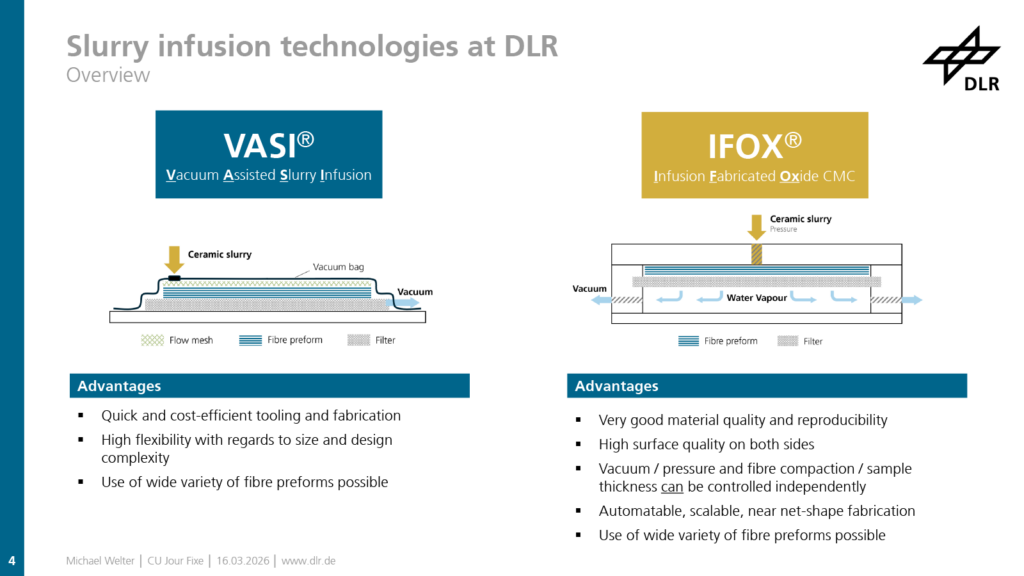 Am Institut für Frontier Materials auf der Erde und im Weltraum des DLR beschäftigt man sich seit vielen Jahren mit Faserverbundkeramiken, auch liegt hier ein Fokus auf oxidischen Werkstoffen. Eine wesentliche Einschränkung bei der Industrialisierung oxidischer CMC ist das Fehlen skalierbarer Fertigungstechnologien sowie geeigneter Automatisierungslösungen. Um dem zu begegnen, entwickelte das Institut zwei Verfahren, VASI (Vakuuminfusion) und IFOX® (druckunterstützte Infusion). Während VASI eine flexible Fertigung für Prototypen und Vorserien ermöglicht, erlaubt IFOX® großflächige CMC-Herstellung in der Serie, wobei aufgrund geschlossener Formen gute Oberflächenqualitäten erzielt werden. Bisherige Projekte, die die Technologien nutzen, brachten beispielsweise Hitzeschutzpaneele für Helikopter, komplex geformte Radome und Hitzeschutzkomponenten für Landebeine von Raketen hervor. Das DLR steht für Kooperationen gerne zur Verfügung.