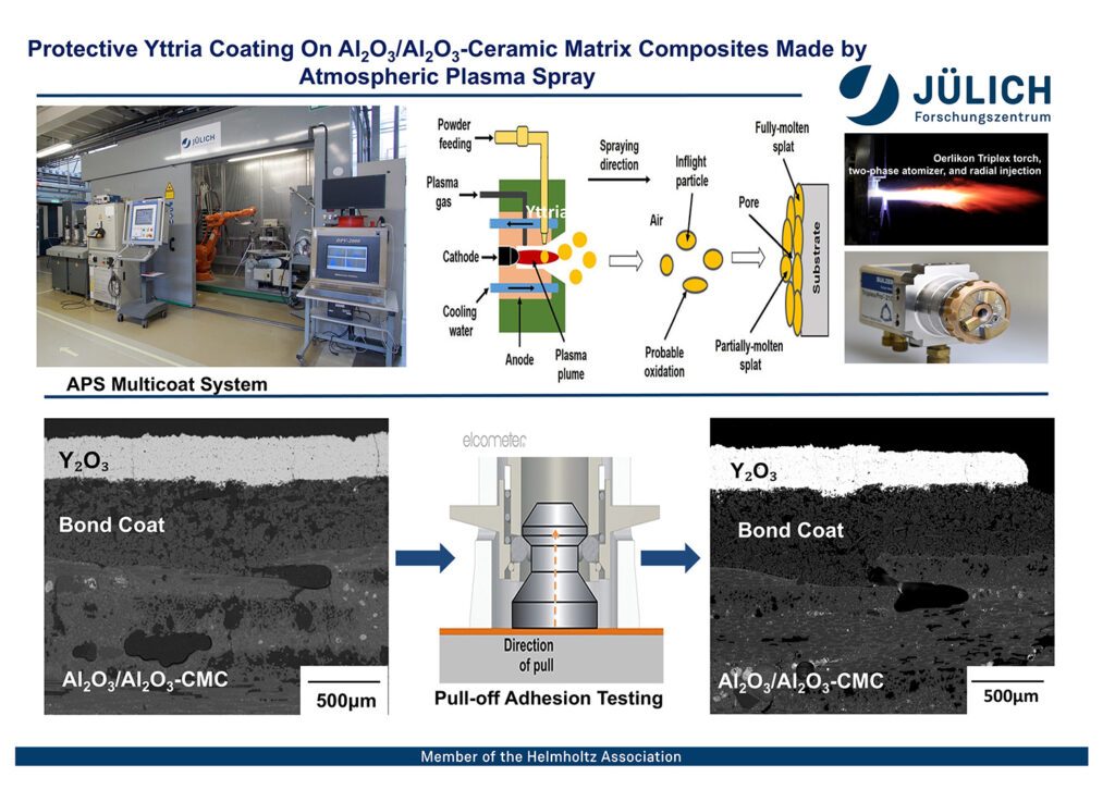 Obwohl oxidische Faserverbundkeramiken selbst oxidationsbeständig sind, können sie bei extremen Temperaturen und besonders in korrosiven, feuchten oder erosiven Umgebungen degradieren, wobei z. B. das Eindringen von Wasserdampf eine Rolle spielt. Als Barriere gegen diese kritische Einwirkung setzt das IMD-2 des Forschungszentrums Jülich auf schützende Yttrium-Beschichtungen als Environmental Barrier Coating (EBC). Untersucht werden am Institut unter anderem das Anbindungsverhalten, da Delamination einen kritischen Aspekt darstellt. Hierbei wird der Einfluss verschiedener Aufbringungsverfahren sowie der Nutzung eines Bond Coats durch umfangreiche Analysen, beispielsweise „Pull-off“-Adhäsionstests erforscht. Das Forschungszentrum unterstützt gerne bei Beschichtungs-Fragestellungen.