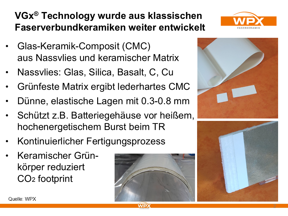 Aus den Erfahrungen im Kerngeschäft von WPX, dem Entwickeln von Chargier-Hilfen aus oxidischer Faserverbundkeramik für die Metallverarbeitung, wurde eine Folie als Brandschutz für Batterien entwickelt, die beispielsweise in der E-Mobilität zum Einsatz kommen kann. Bei einem Batteriebrand („Thermal Runaway“) entstehen schlagartig Temperaturen von bis zu 1300 °C, die durch Batteriegehäuse wirksam abgeschirmt werden müssen. WPX verwendet hier Folien auf Basis von Nassvliesen mit einer grün-härtenden keramischen Matrix, die eine lederartige, flexible Struktur aufweisen (0,3 – 0,8 mm Dicke). Batteriegehäuse können entsprechend als Mehrlagensysteme mit der Folie entwickelt werden und auch komplexere Geometrien bei der Fertigung umgesetzt werden. Die Firma WPX bietet ihre Brandschutzfolien neben Zulieferern der Automobilindustrie auch anderen Branchen an.